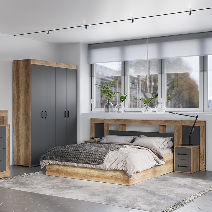 Коллекция "Прима" в модном декоре Дуб каньон/Графит или Бетон пайн светлый удачно вписывается в городской индустриальный стиль и выглядит очень необычно и оригинально. Приятный корпус под дерево и матовые тёмные фасады - такое контрастное сочетание добавит комнате стиля.