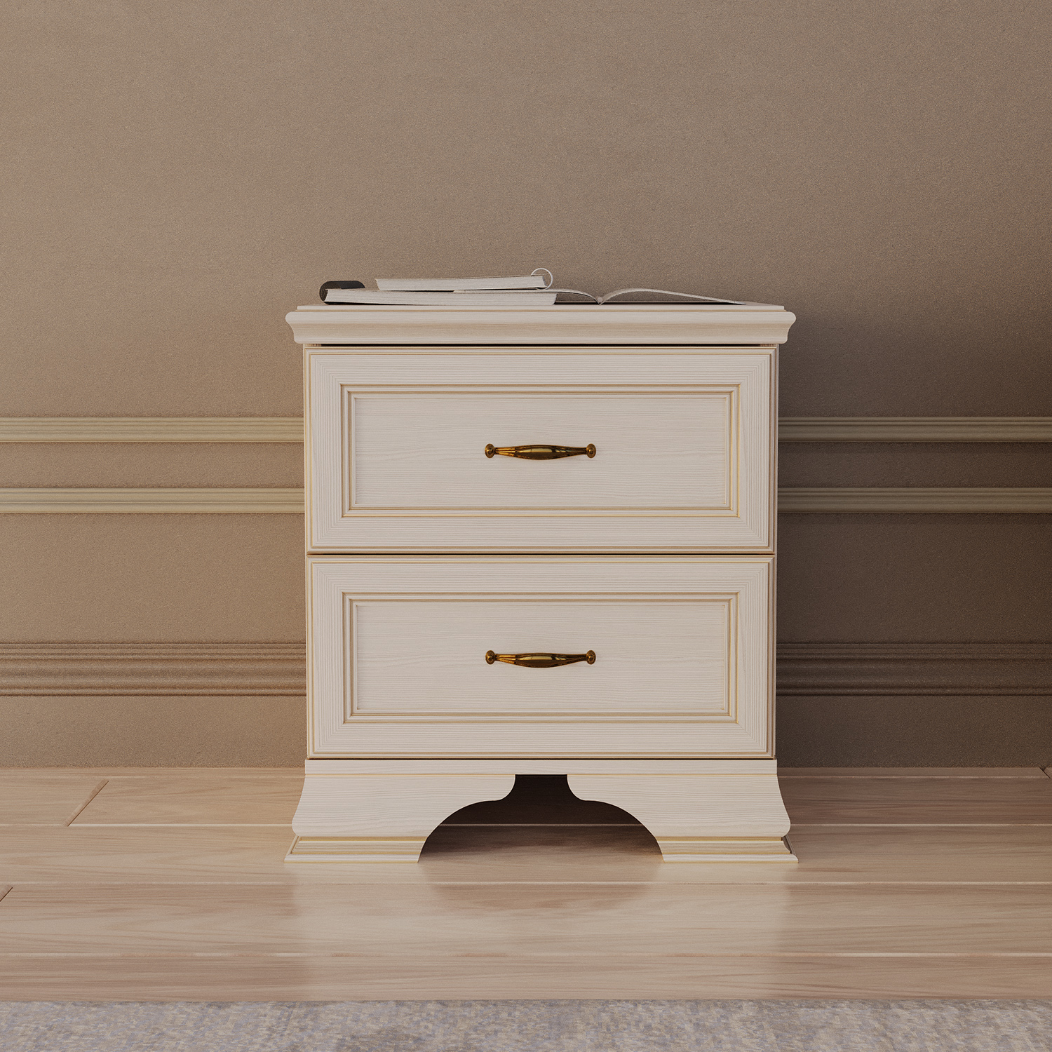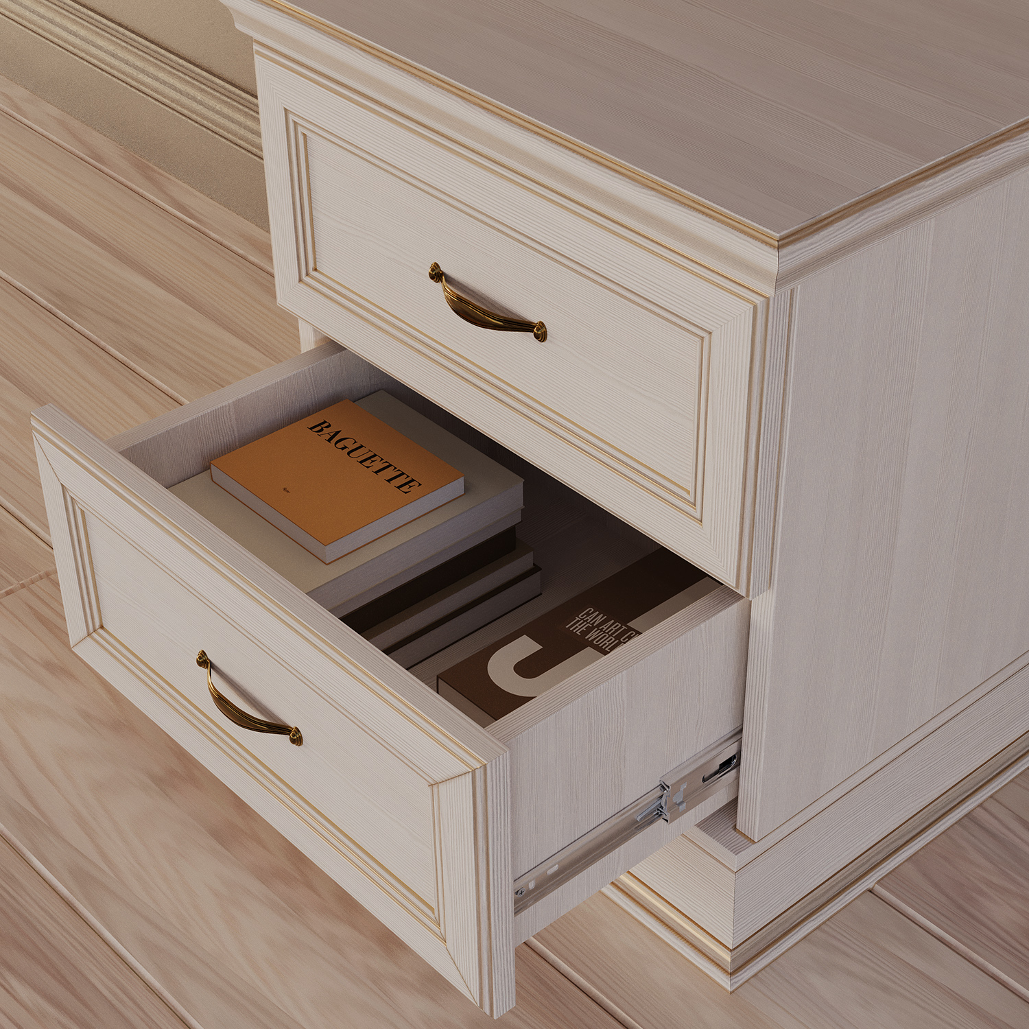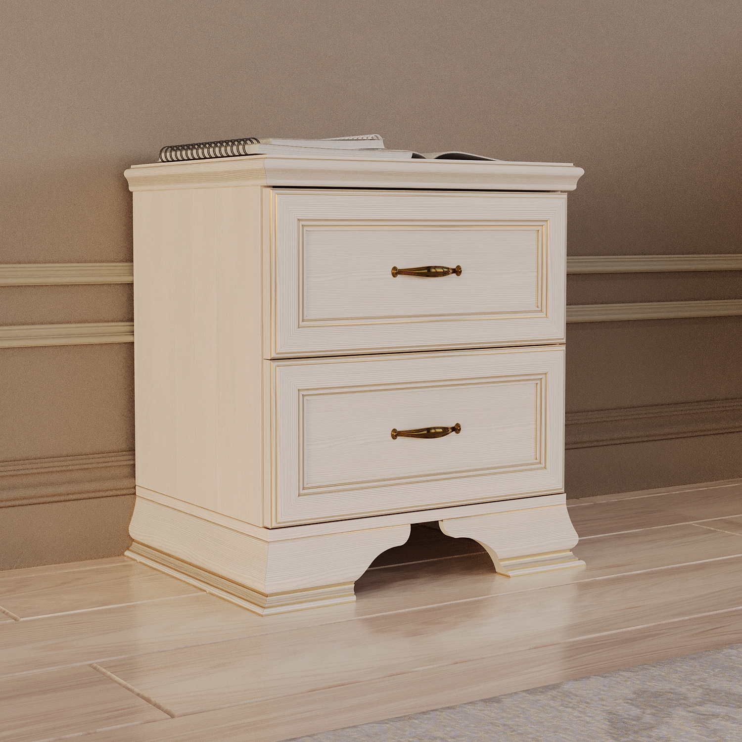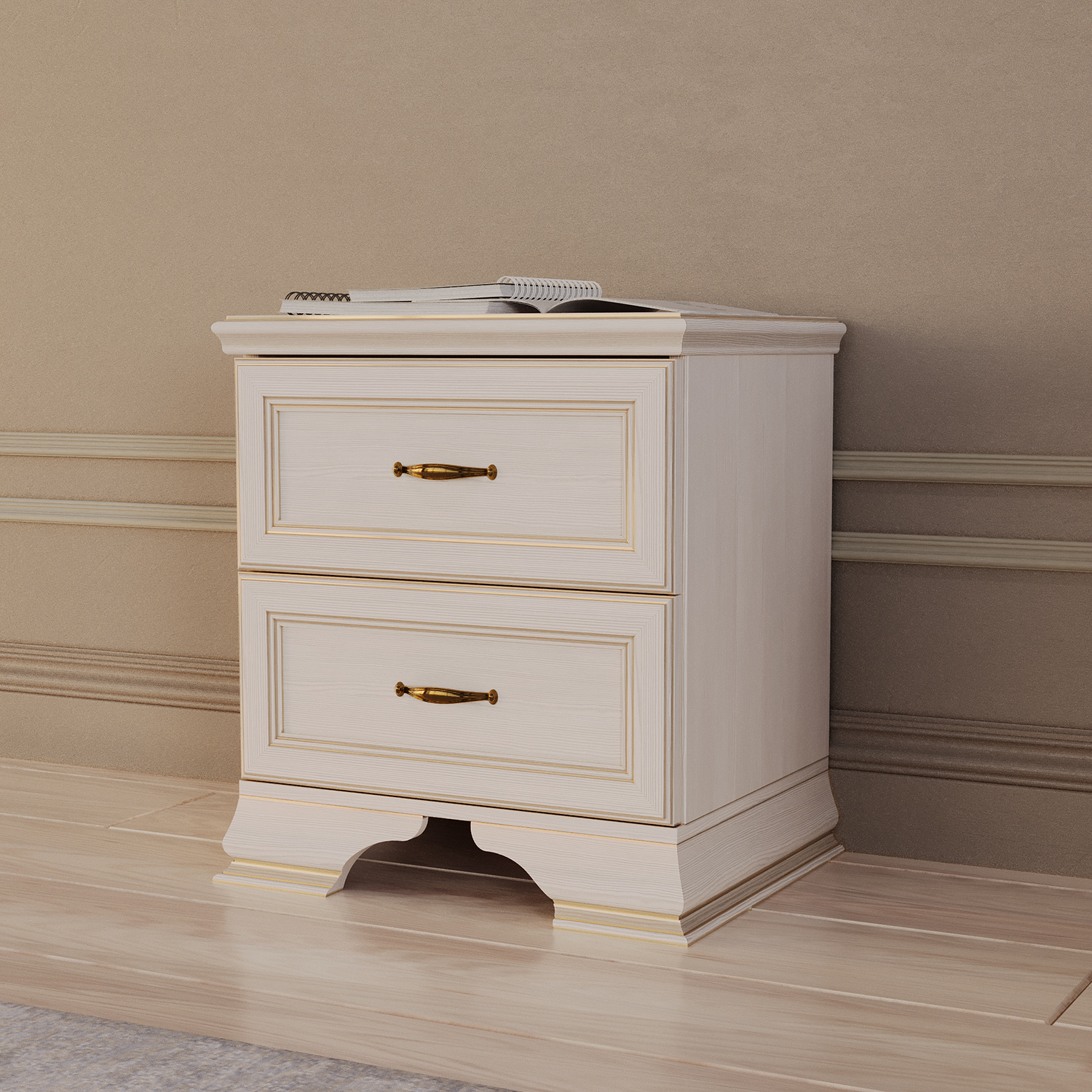 Материал корпуса тумбы ЛДСП с финишной пленкой «Бодега белый» - светлый и теплый оттенок с древесной текстурой. В качестве декора применяются профили на крышке и в качестве обрамления фасадов, а также эффектные опоры, которые придают мебели надежный вид. Акценты на изгибах рельефных деталей расставлены при помощи золотой патины, а в качестве лицевой фурнитуры применяются нарядные ручки цвета старая бронза.
